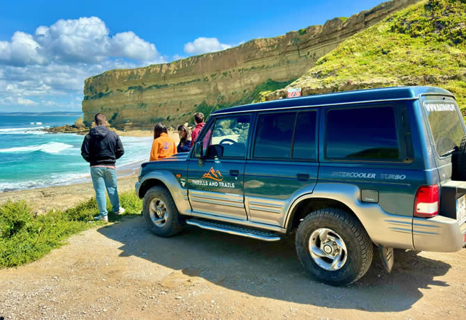 A jornada continua em terra firme com um emocionante passeio de jipe 4×4 até ao místico Cabo Espichel. Explore trilhos panorâmicos, visite o histórico Castelo de Sesimbra e deslumbre-se com o Santuário de Nossa Senhora do Cabo e o seu farol imponente. Para os amantes de história, a paragem nas pegadas de dinossauros fossilizadas é obrigatória. O dia termina com a envolvência selvagem da Praia da Foz, garantindo memórias inesquecíveis entre a serra e o mar.