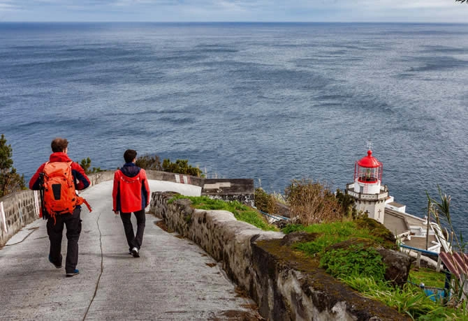Visitaremos um antigo porto de baleeiros e o baloiço garrido das embarcações no cais, culminando na beleza serena da Ponta do Sossego.