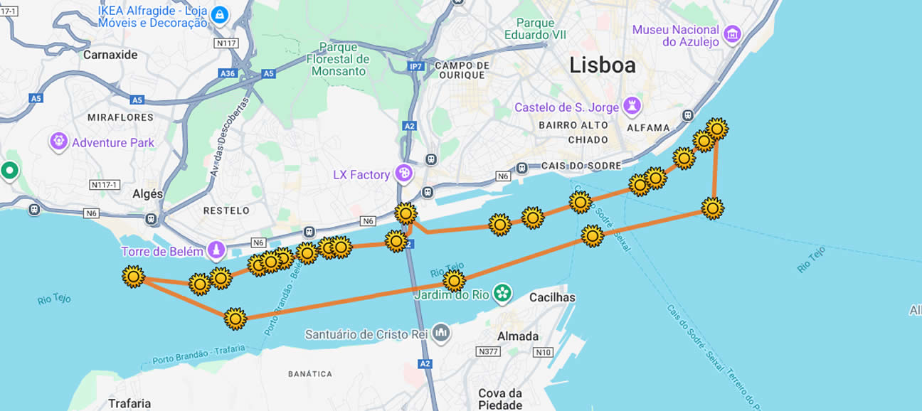 Visualizamos desde o Rio Tejo : Monumento dos Descobrimentos, Mosteiro dos Jerónimos, Museu de Arte, Arquitectura e Tecnologia (MAAT), Palácio da Ajuda, Ponte sobre o Tejo, Basílica da Estrela, Cais do Sodré, Praça do Comércio, Alfama, Sé de Lisboa, Castelo de S. Jorge, Mosteiro de S. Vicente de Fora, Panteão Nacional, Cristo Rei, Torre VTS, Fundação Champalimaud e Torre de Belém.